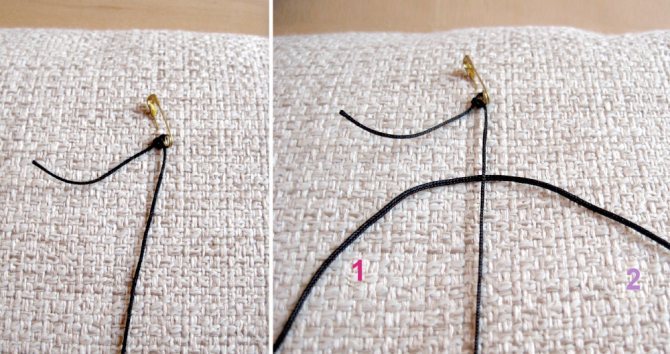 Нужно первым делом нарезать шнур на три шнура разной длины: один будет коротким, равным длине запястья, прибавка на облегание и размер бусин, и завязки браслета; два других длинных, которыми будут плестись узелки и оплетаться бусины. Далее шнуры закрепляются на планшете или на подушке булавкой, отступив несколько (7-8) сантиметров на завязку, и начинается плетение. Расположить шнурки надо так: два длинных по краям от короткого.