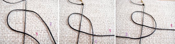 - По достижении нужной длины нужно потянуть ходовой шнур через последний ряд. Его конец должен находиться справа. Между петлями нужно сделать промежутки, а вокруг обратной стороны застежки – еще три петли.