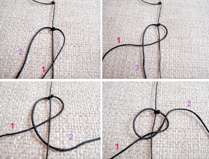 1) Первыми идут узелки, их нужно сделать 1 или 2, двойных плоских. Связать узел надо так: сначала плетется левый одинарный плоский узел, следом под ним правый одинарный плоский узел, так получается двойной плоский узел, чтобы узлы выглядели ровными и аккуратными, надо короткий шнур, которая идет внутри узла, так сказать, основа, регулярно подтягивать. На фото видно последовательность плетения узелка: