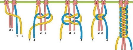 - Совет: лучше сначала попробовать плести из скрученных ниток мулине, а затем начинать плетение узлов из шнуров.