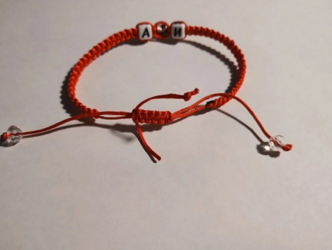 4) На концах завязок браслета надеваются на любой шнурок с каждой стороны по одной маленькой бусине.